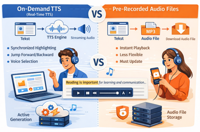 Begge kan fungere teknisk godt, men on-demand gir klare pedagogiske og tilgjengelighetsmessige fordeler, særlig for lesesvake, elever og eldre.